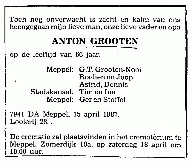 op 28 januari 1839 te Steenwijksmoer (Coevorden), overleden 13