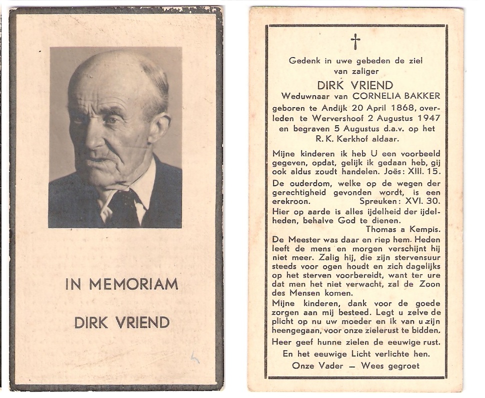6 Willem Vriend, geboren 31 maart 1737 in Venhuizen, overleden 4 juni 1792 in Zwaagdijk, getrouwd op 5 oktober 1761 in Grootebroek met Dieuwertje van der Gracht, geboren 31 december 1734 in Zwaagdijk, overleden 15 april 1784 in Zwaagdijk.